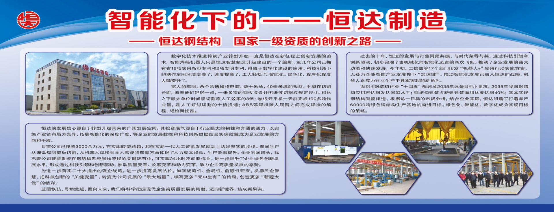 我公司是一家從事研發(fā)、銷售、制造和施工于一體的大型鋼結(jié)構(gòu)工程企業(yè),同時也是涂鍍鋼品及配套建筑圍護(hù)材料系統(tǒng)的專業(yè)生產(chǎn)廠商。多年來,逐漸確立了以商務(wù)寫字樓、賓館、高層住宅等為主的高層鋼結(jié)構(gòu)建筑體系,以大型煤倉、高鐵車站、體育場館等公共建筑為主的空間大跨度鋼結(jié)構(gòu)建筑體系,以工業(yè)廠房、低溫物流庫、多層鋼結(jié)構(gòu)建筑等為主的輕鋼結(jié)構(gòu)建筑體系。